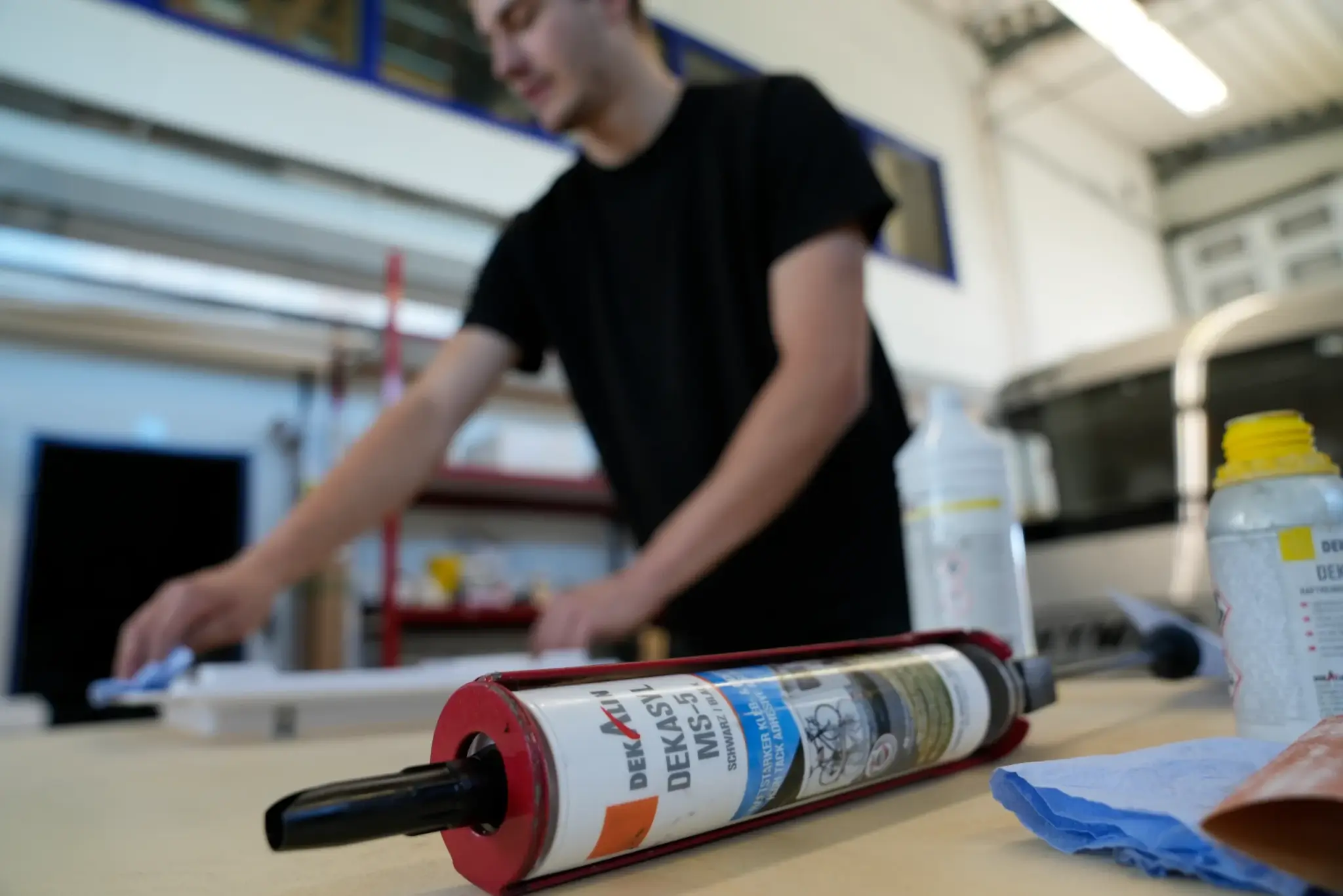 - Klebstoff vorbereiten: Öffnen Sie die Kartusche DEKASYL MS-5 und befestigen Sie die Spitze. Halten Sie die Kartusche im 90°-Winkel, da die speziell geformte Düsenspitze für die gewünschte Höhe der V-Raupe sorgt. Tragen Sie den Klebstoff in einer V-Raupe (ca. 8–10 mm Breite) auf die vorbereitete Fläche oder den Rahmen des MaxxFan auf.