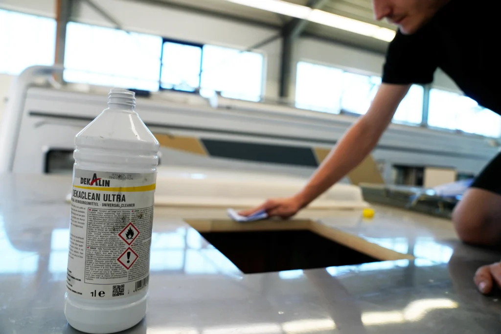 - Entfernen Sie Schleifstaub gründlich mit einem fusselfreien Tuch und reinigen Sie die Flächen erneut mit DEKACLEAN Ultra. Es ist wichtig immer vor und nach dem Schleifen zu reinigen. Reinigt man nicht zu vor dem Schleifen so kann sich der Schmutz in die Oberfläche einpressen so dass sie nicht mehr gut zu reinigen ist.